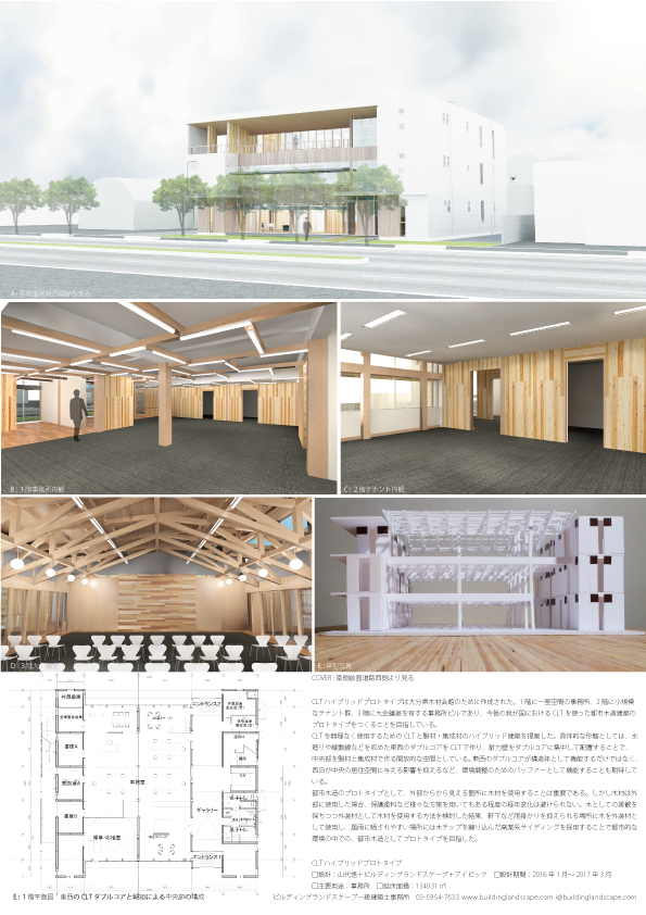 CLTハイブリッドプロトタイプは大分県木材会館のために作成された。1階に一室空間の事務所、2階に小規模なテナント群、3階に大会議室を有する事務所ビルであり、今後の我が国におけるCLTを使った都市木造建築のプロトタイプをつくることを目指している。