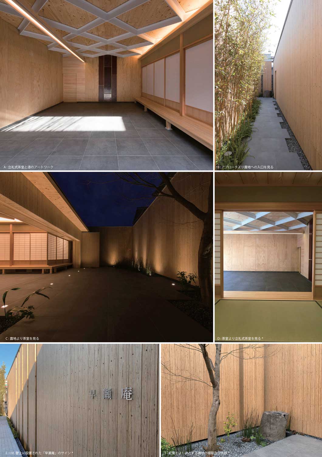 平屋の建物で、もみじ饅頭の手焼き体験が行えるエリアと上田宗箇流の茶室によるエリアが路地を介してつながる構成となっている。内部空間は173m²であるがLVL厚板の壁にぐるりと囲まれた中に茶室やそこに至るシークエンスを作る路地、中庭を取り込むように計画されており、それらを含めると外形としては262m²程度の建物となる。ロードサイドに立地し周囲に建物が立ち並んだ環境にあっても、茶室にふさわしい落ち着いた空間を実 現する平面計画とした。